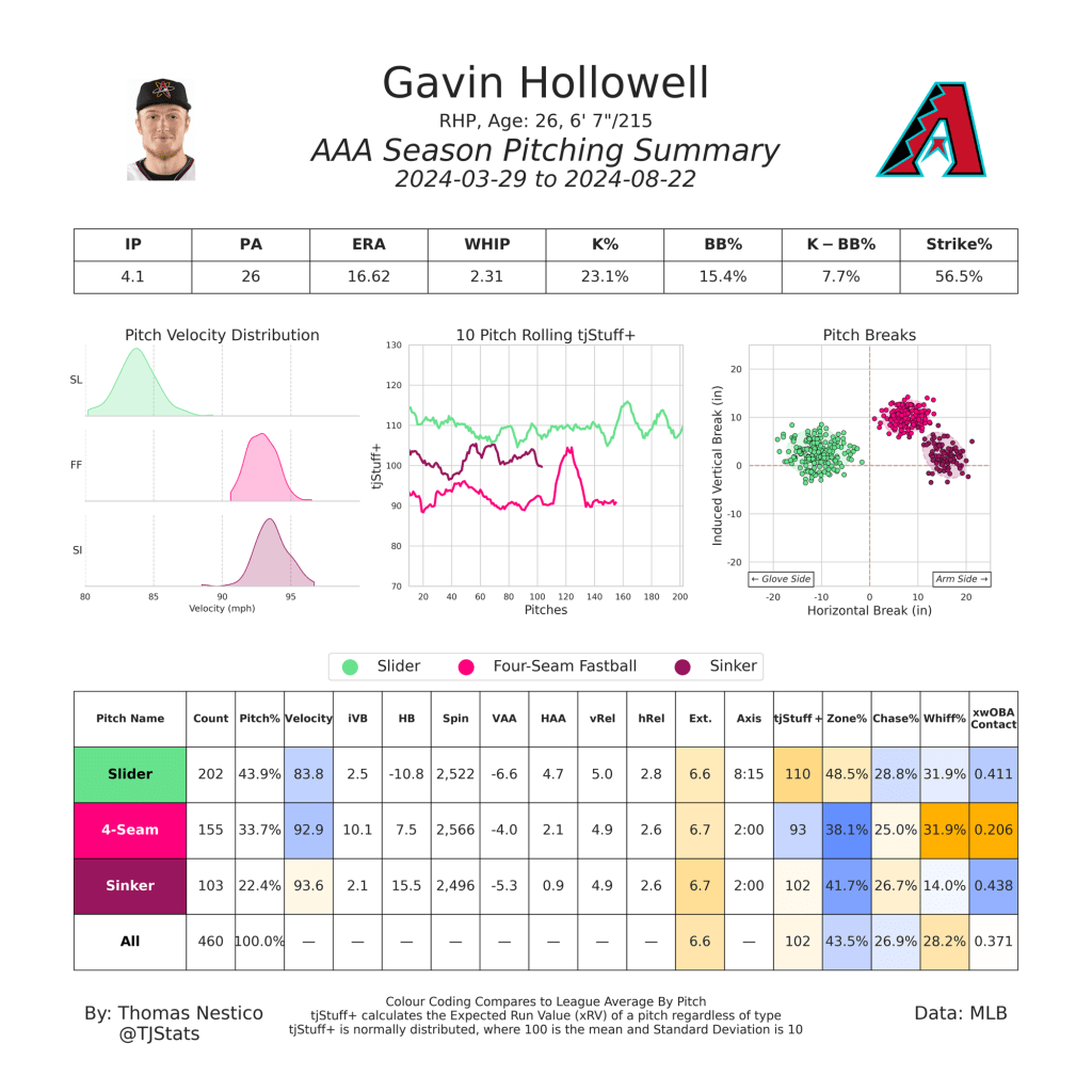 Taking Bote’s spot on the 40-Man roster is Right Handed Pitcher Gavin Hollowell, as the Cubs claimed him off waivers from Arizona and optioned him to Iowa. Hollowell appeared in 32 games across 2022 and 2023 for the Colorado Rockies, pitching to a 2-2 record with a 6.20 ERA in 40.2 innings across those two seasons, striking out 40 batters and walking 22. He even picked up a save as well. The Rockies put him on waivers in June, and he was claimed by the Diamondbacks but never got into a big league game for them. He pitched 17.1 innings in AAA for Arizona, pitching to a 3.63 ERA, a 30.4% strikeout rate, and a large 16.5% walk rate. He’s a guy the Cubs are taking a flier on, and pictured below is his pitching profile from this season using Thomas Nestico’s pitching summary app. (Note that it appears the bar showing IP, PA, ERA, etc. appears to be bugged so ignore that)